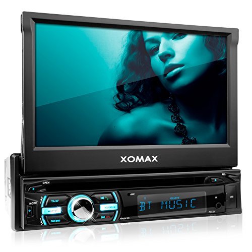 XOMAX XM-DTSB925 Car Stereo / Car Radio / Moniceiver + 18 cm / 7" touch screen + Bluetooth handsfree and music playback (A2DP) + codefree DVD / CD player + USB port (up to 128 GB) and SD slot (up to 128 GB) for audio, video, MP3, MPEG4, WMA, AVI, JPEG etc. + Detachable front panel+ 7 LED Colours blue, red, yellow, purple, pink, green, white, turquoise - Single DIN (DIN 1) Standard Installation Size + Including Cage, Trim and Remote Control