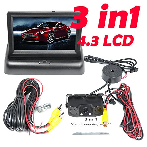 BW New 3 in 1 Sound Alarm CCD HD Car Reverse Backup LED Rear View Camera Parking Video Radar System + 4.3" Foldable Digital TFT LCD Car Reversing Monitor